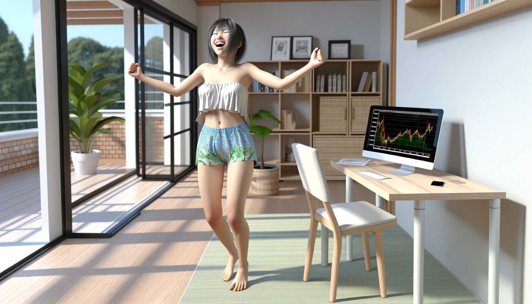 DALL·E 2024-02-19 15.06.21 – A CGI rendering of a Japanese female college student, ecstatic about her stock portfolio’s performance, standing in her room, gesturing triumphantly. 2024.08.30スポンサーリンク